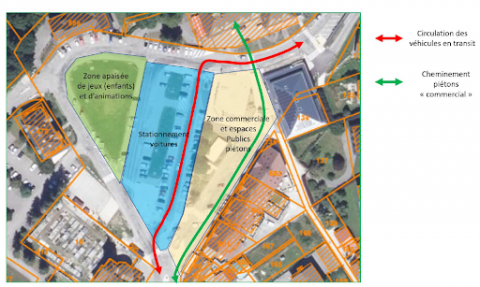 La mesure principale qui a été proposée lors de l’atelier est de fermer la travée centrale par des barrières bois pour en éviter la traversée, la réserver au stationnement, et ainsi sécuriser l’aire de jeux des jeunes dans l’espace vert à proximité. Voir illustration ci-contre.