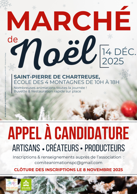 Cette année le Marché de Noël se tiendra le dimanche 14 décembre 2025 de 10h à 18h dans les locaux (intérieur et extérieur) de l'école des 4 Montagnes (Saint-Hugues de Chartreuse), de nombreuses animations sont prévues pour rythmer cette belle journée ! Buvette et restauration rapide sur place.