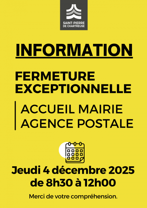 L'Agence Postale Communale et l'accueil de la Mairie de Saint-Pierre de Chartreuse seront exceptionnellement fermées au public le jeudi 4 décembre 2025 de 8h30 à 12h.