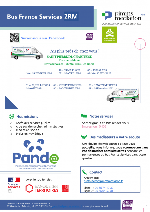 Le Bus France Service est présent sur la Commune de Saint-Pierre de Chartreuse, un lundi sur deux (voir les dates ci-dessous) de 12h30 à 15h30 devant la Mairie.